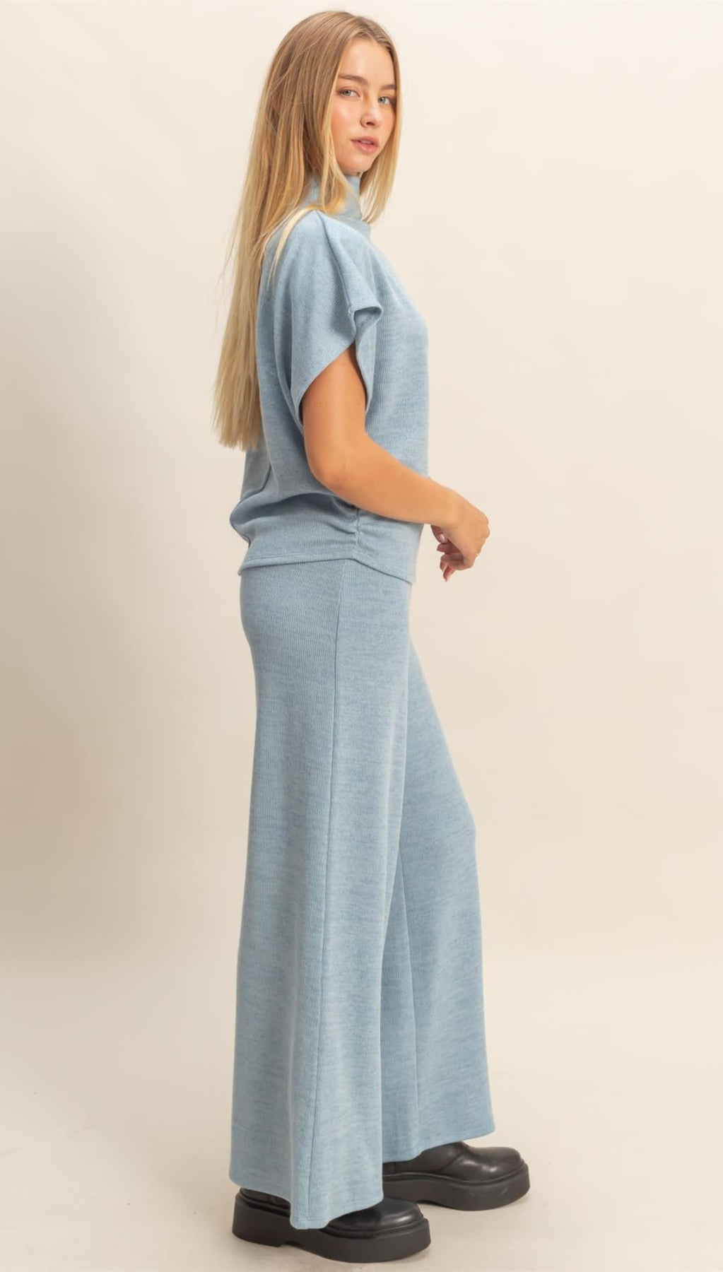 A woman modeling a light blue knit two-piece set, featuring a short-sleeved mock neck top and wide-leg pants.