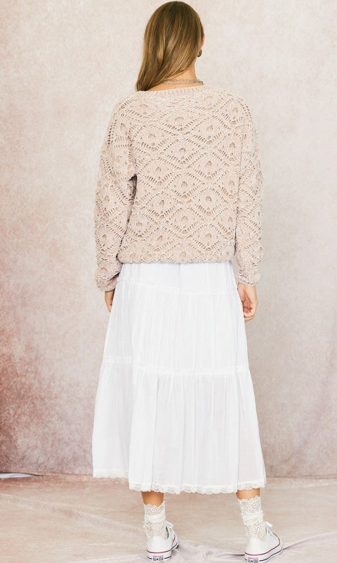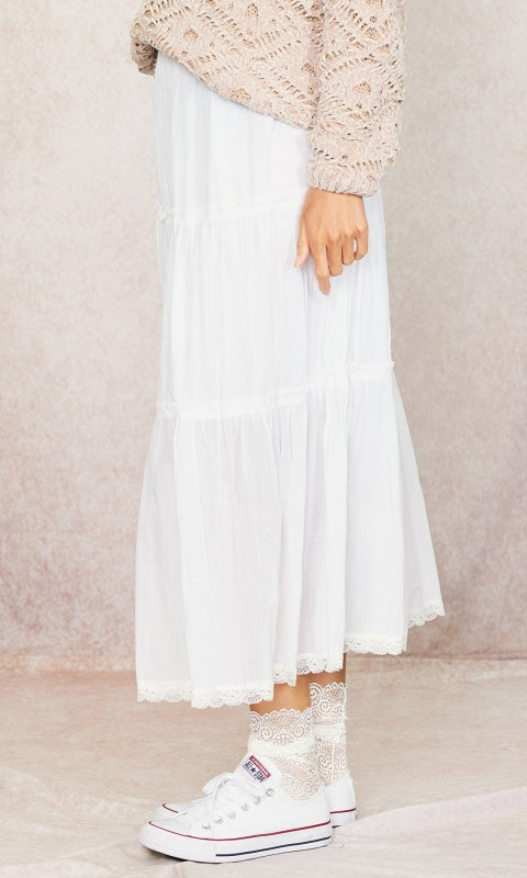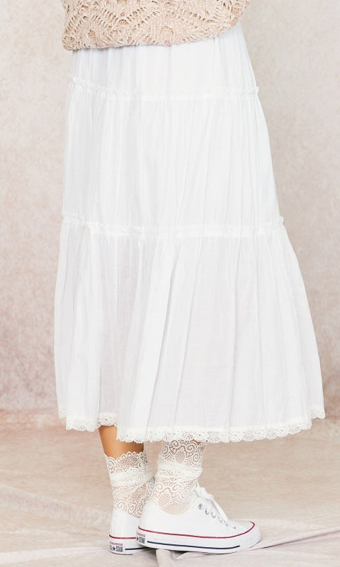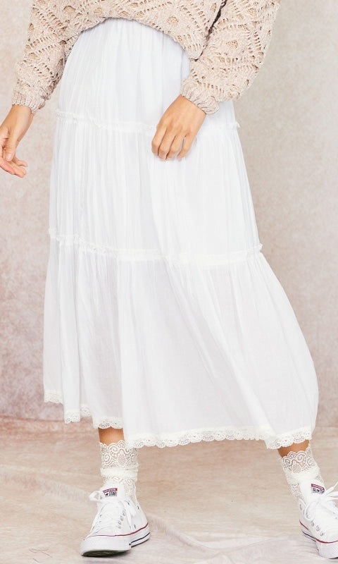 - Make a statement with the Rory Ruffle Skirt! Crafted from cotton fabric with delicate lace inserts, this maxi skirt features voluminous tier ruffles and an elastic waistband for a comfortable fit. Perfect for adding a romantic touch to any outfit. Who will you be with this skirt?