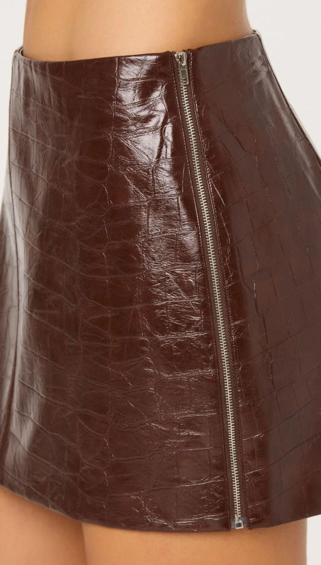 Brown crocodile-embossed faux leather mini skirt with a central front zipper.
