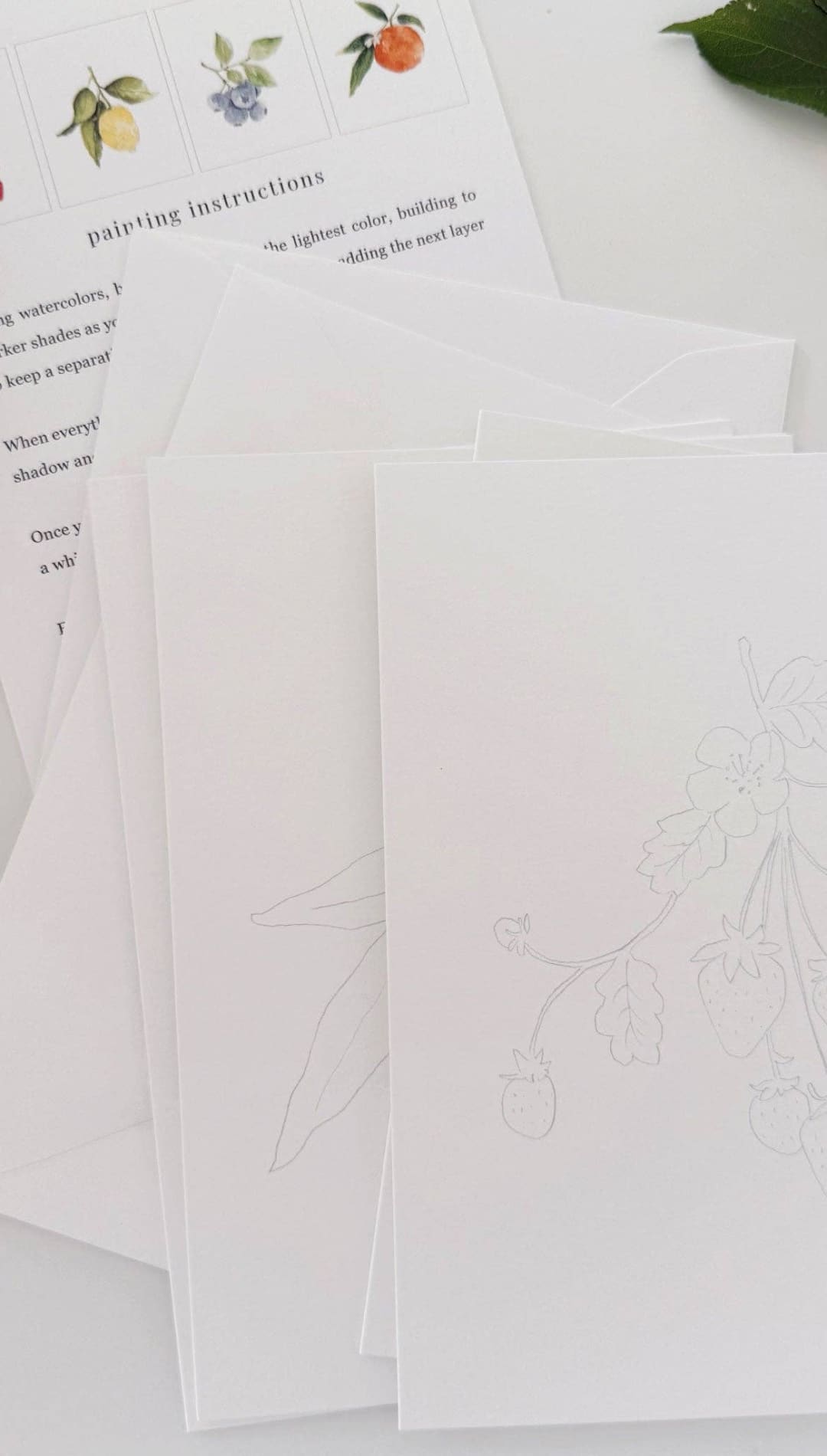 Paint your own special cards and send to loved ones! Sketches are printed on the front of each card with simple instructions for you to paint in with watercolors. You'll receive eight cards with two of each fruit illustration. Perfect for artists of all ages!