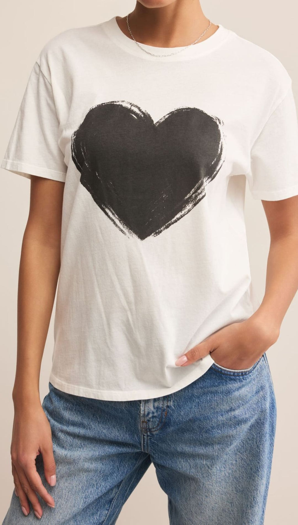 This playful white tee sports a bold black heart graphic that’s sure to catch the eye. With a cozy crew neck and breezy short sleeves, it’s made from soft, lightweight 100% cotton jersey with a vintage wash for that perfectly worn-in vibe. Its relaxed fit and 25 1/4-inch length from the shoulder make it a fun and comfy choice for your casual days.
