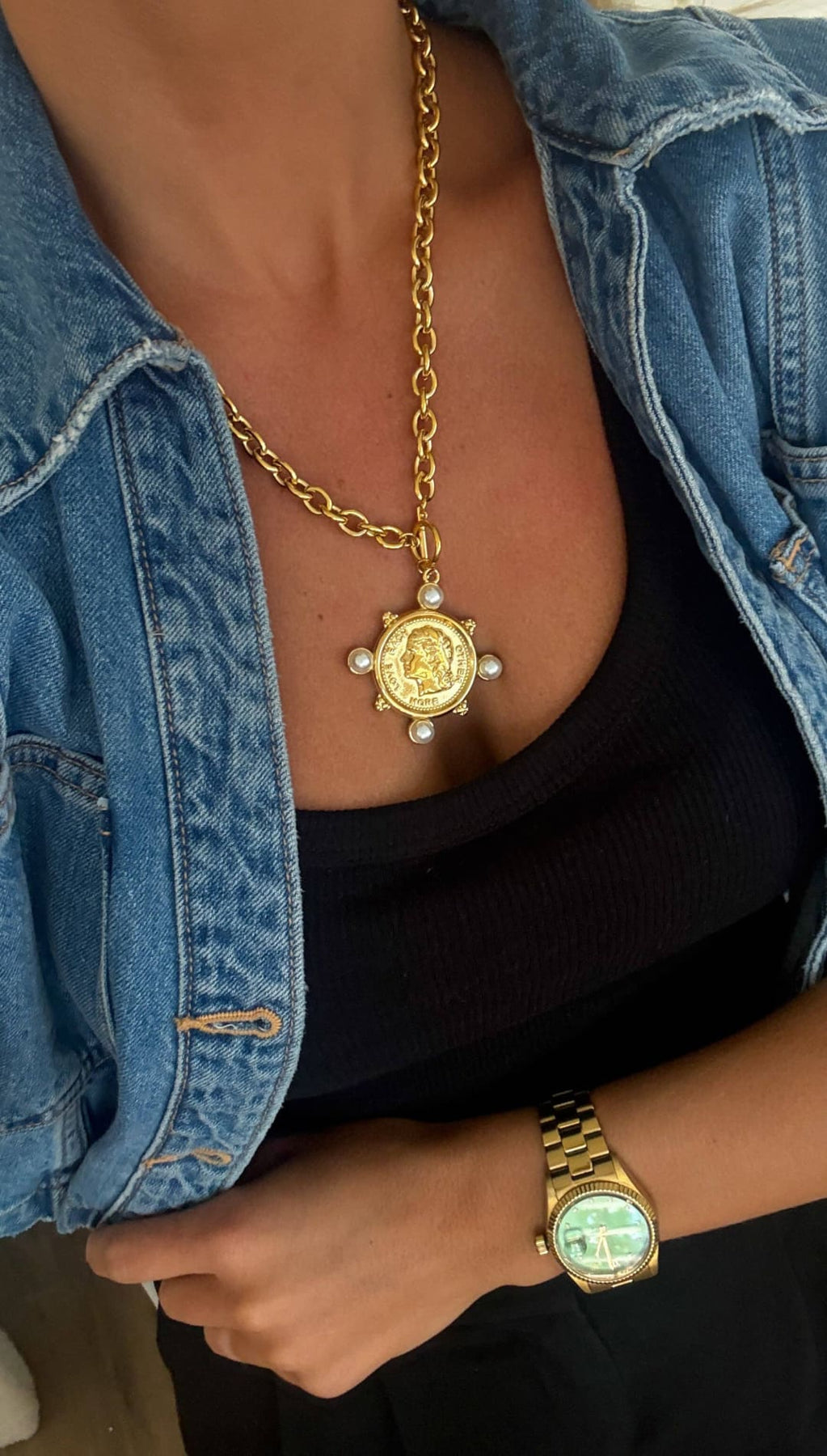 The Pearl Coin Necklace blends classic elegance with a modern twist. Featuring a timeless coin pendant paired with a luminous pearl accent, this gold-toned piece adds effortless sophistication to any outfit.