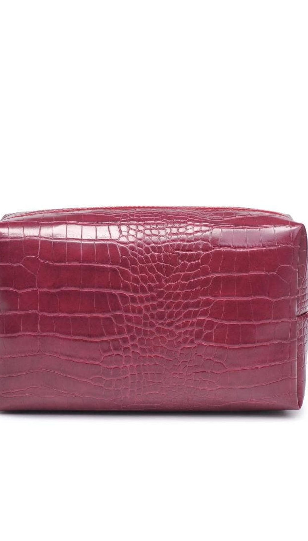 Crocodile-patterned burgundy leather cosmetic bag with gold zipper.
